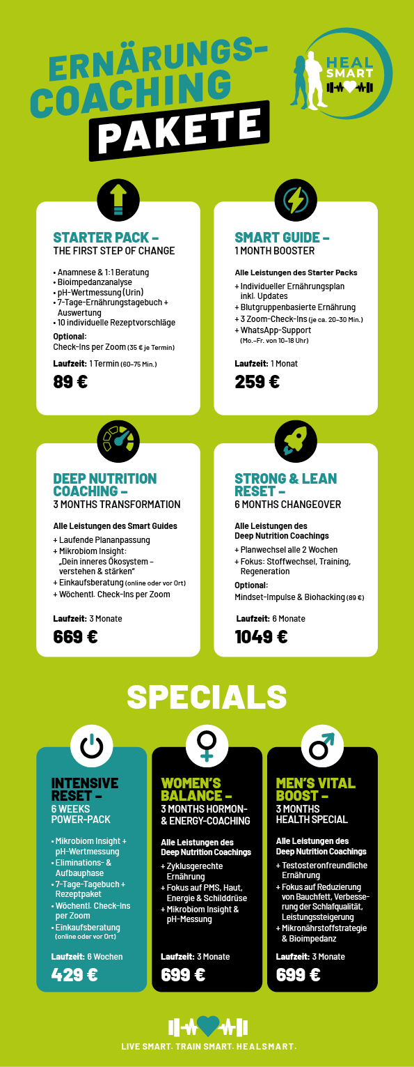 Unsere HEALSMART Coaching-Pakete kombinieren neueste Erkenntnisse aus Medical Fitness, funktionellem Training und mitochondrialer Aktivierung – für sichtbare Fortschritte in Kraft, Haltung, Stoffwechsel und Lebensenergie.